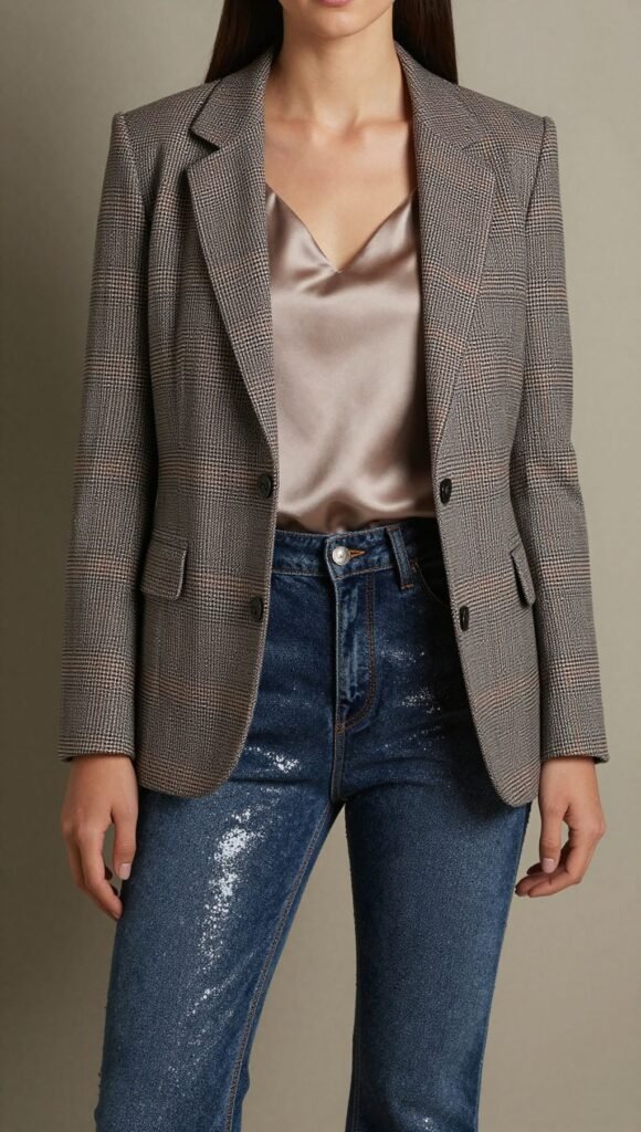 4. Plaid Blazer x Coated Denim Combo