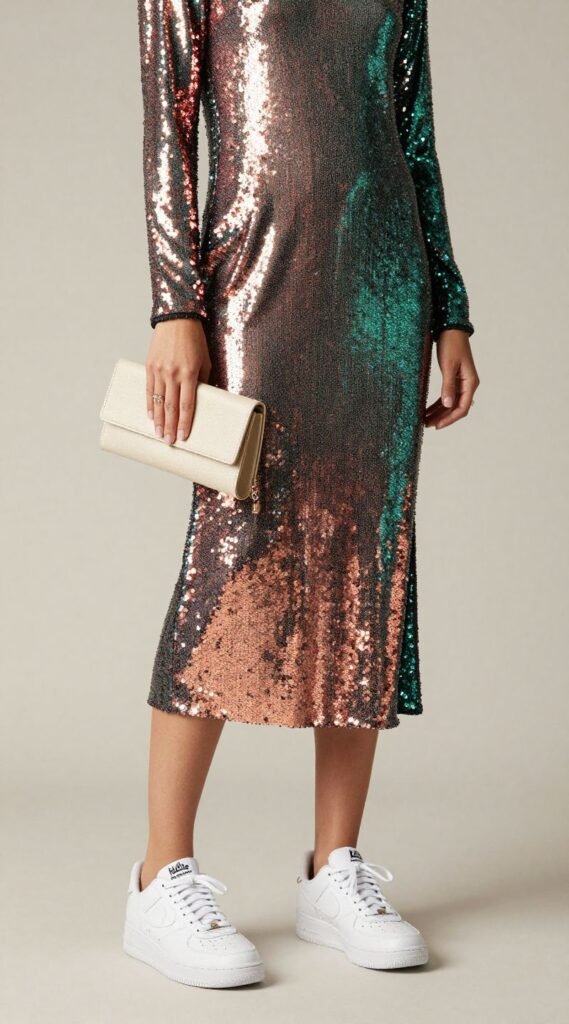 Pair this glitzy number with some pristine, minimalist white leather sneakers. Think a classic Air Force 1 or a sleek Reebok Club C. The contrast between the high-octane glam and the understated cool of the sneakers is pure magic. Add a simple clutch and some delicate jewelry, and you’re ready to dazzle without sacrificing a single dance move.