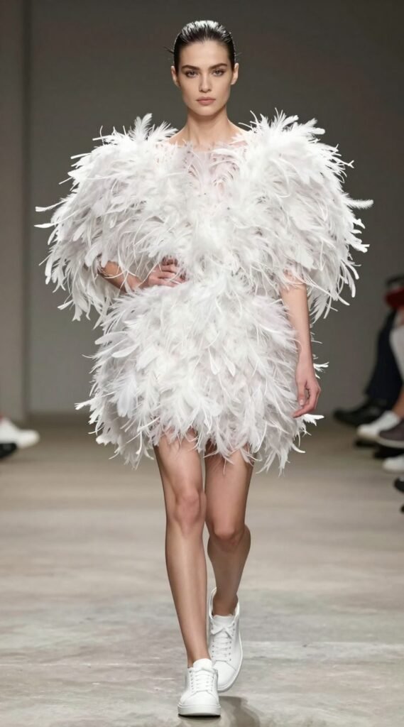 If there’s ever a time to go all out, it’s a sneaker ball. A dress or top adorned with feathers is pure luxury and drama. Imagine a feather-trimmed mini dress or a top with voluminous feather sleeves. It’s playful, opulent, and utterly unforgettable.