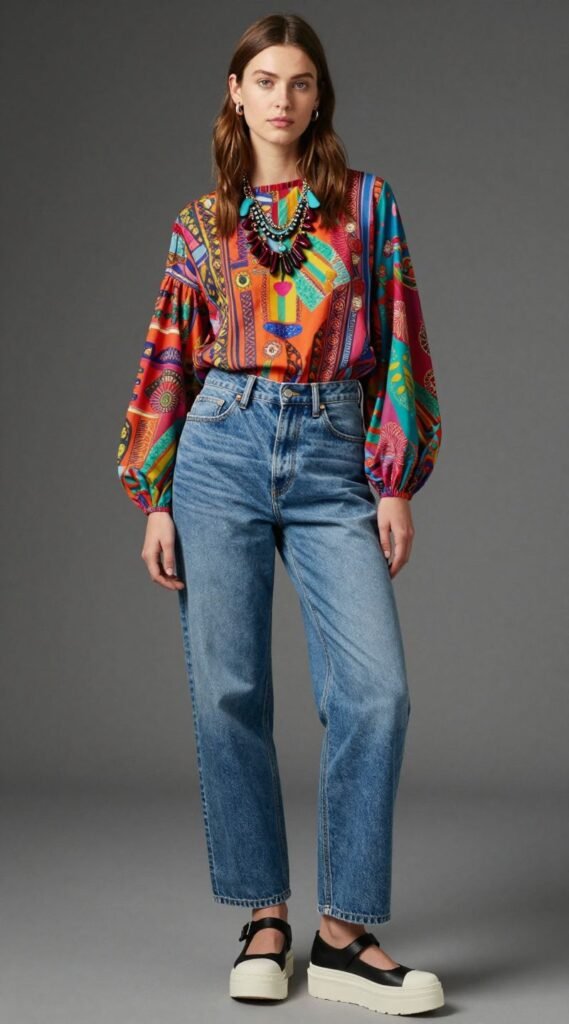 Wear your personality on your sleeve. Pair your jeans with a vibrant, patterned blouse or a hand-painted tee. Look for unique textures and prints.