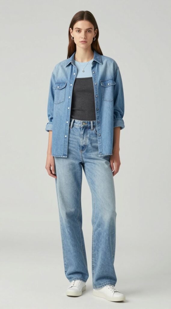 It’s a bold, confident look that embraces the rugged roots of denim while staying super fashionable.