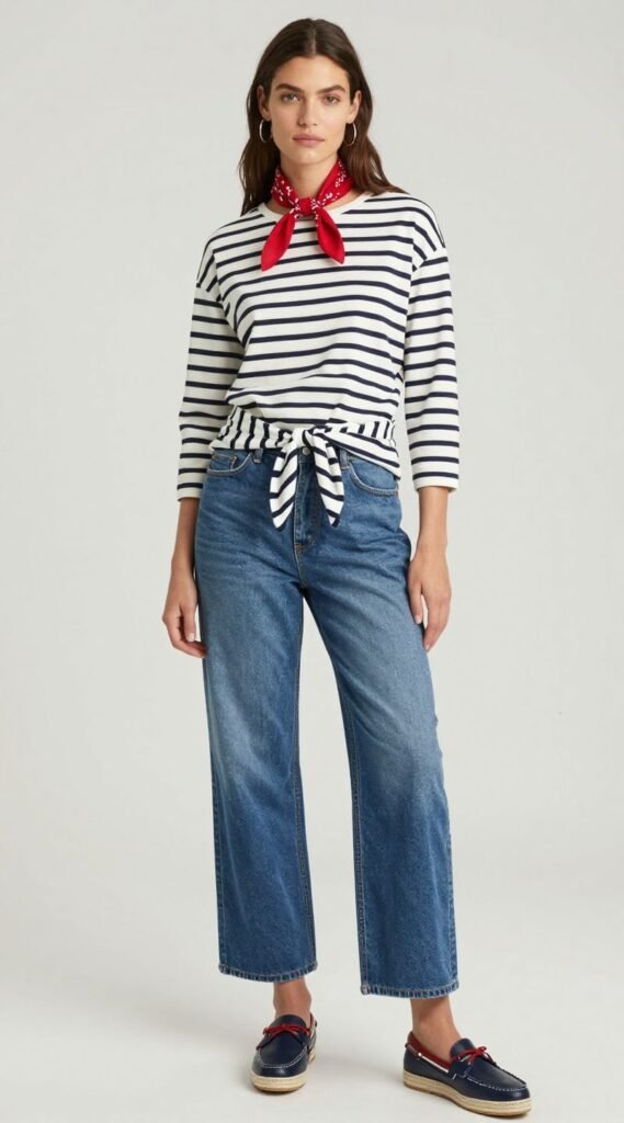 Tuck it in or tie a knot at the waist. Add a red bandana for a pop of color and some classic boat shoes or espadrilles.