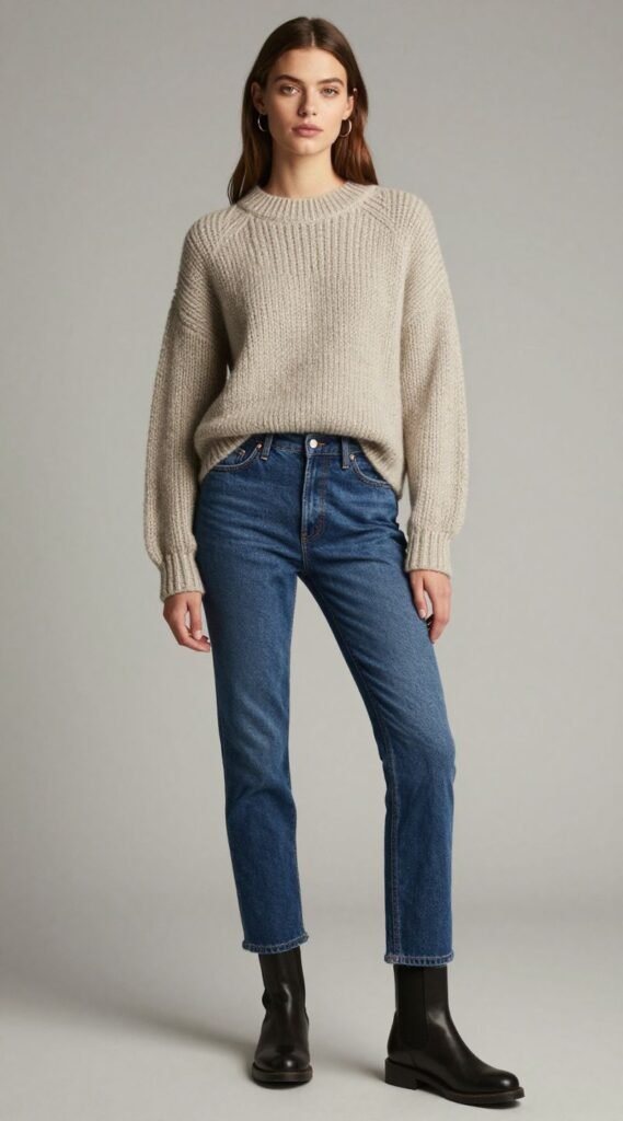 The texture play between soft knit and rugged denim is chef’s kiss, making your outfit feel intentional and stylishly relaxed.