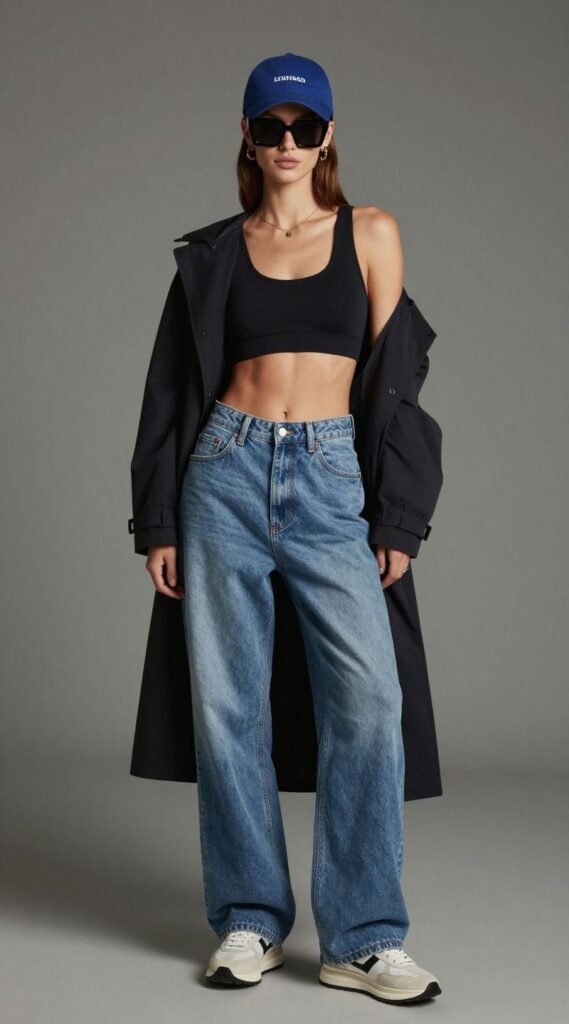 Athleisure, but make it fashion. Pair your baggy jeans with an athletic crop top, a sporty bralette, or even a sleek windbreaker.