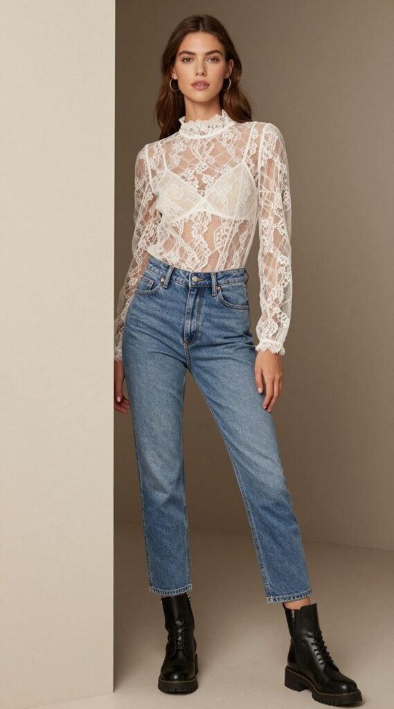The contrast between the soft, ethereal top and the robust denim is pure fashion magic, showing off your daring side.