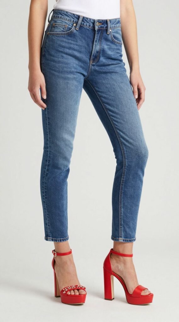 Think bright colored heels, platform sandals, or even embellished flats. Make sure the jeans are just the right length to show them off without dragging.