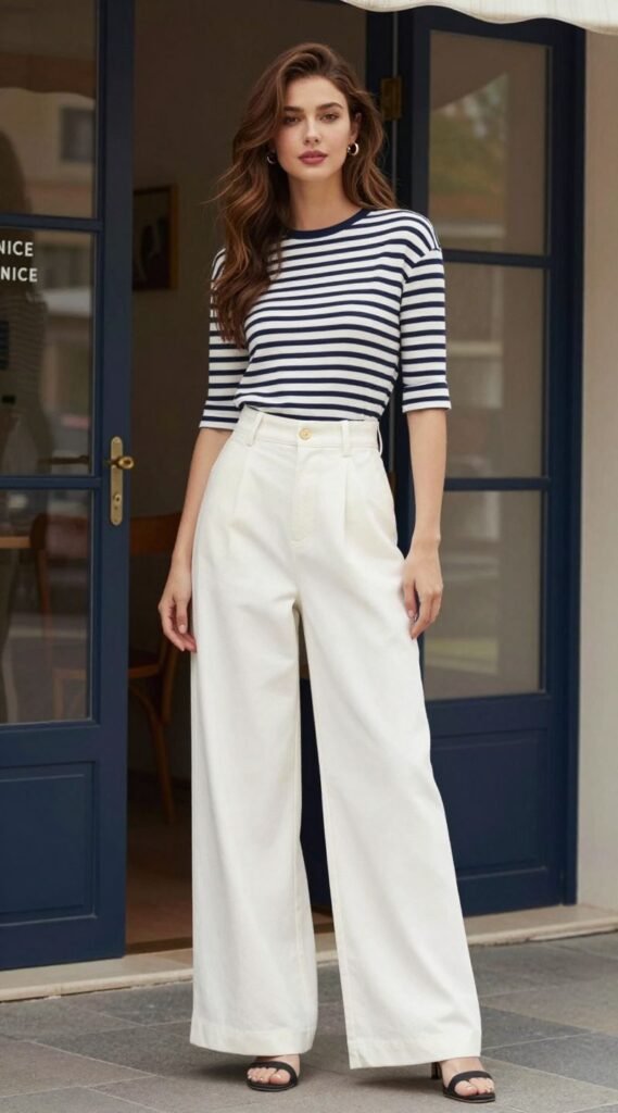 Ahoy there, gorgeous! This look screams summer vacation, even if you’re just heading to the grocery store. Grab your favorite pair of white wide-leg trousers โ the breezier, the better โ and pair them with a classic navy and white striped top. It’s a timeless combo that just works.