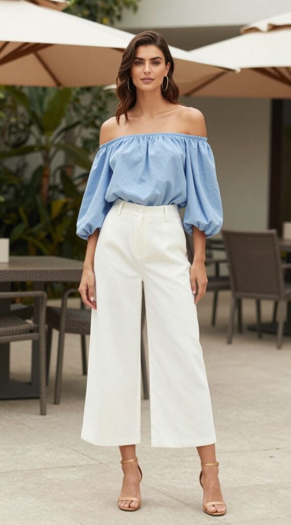 Even if your resort is just your backyard, you can dress the part. Think white cropped wide-leg pants paired with a breezy off-the-shoulder top in a pretty pastel or a classic blue. Itโs vacation vibes, bottled.