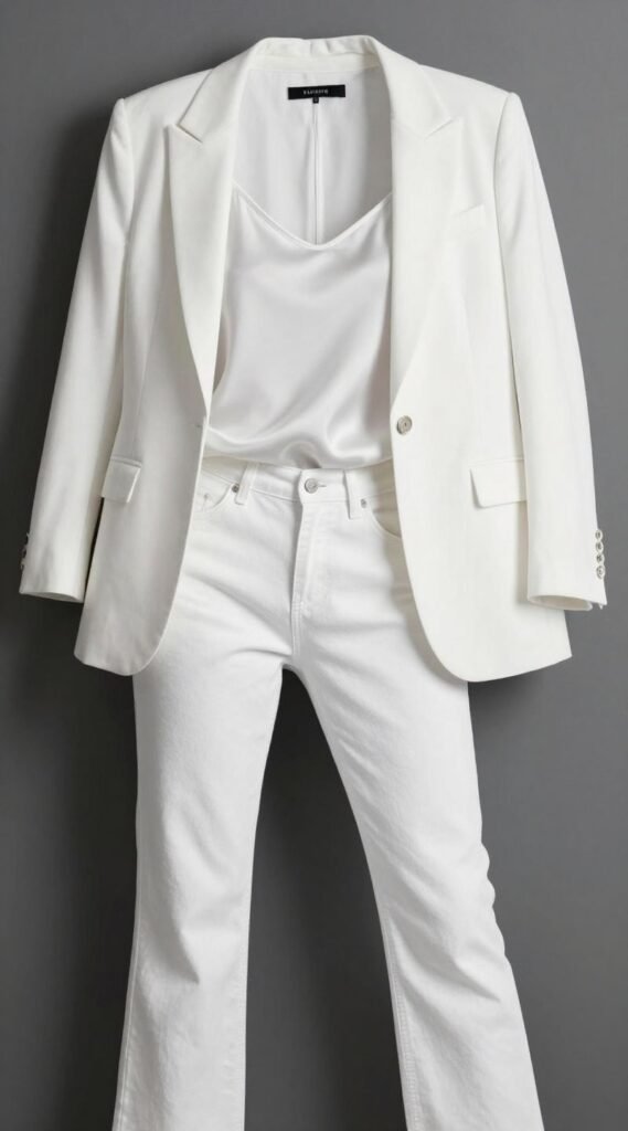 Feeling bold? Go head-to-toe white. This isn’t just an outfit; it’s a statement. Mix different textures โ think white denim jeans with a flowy silk white camisole and a structured white blazer. It keeps the look from falling flat.
