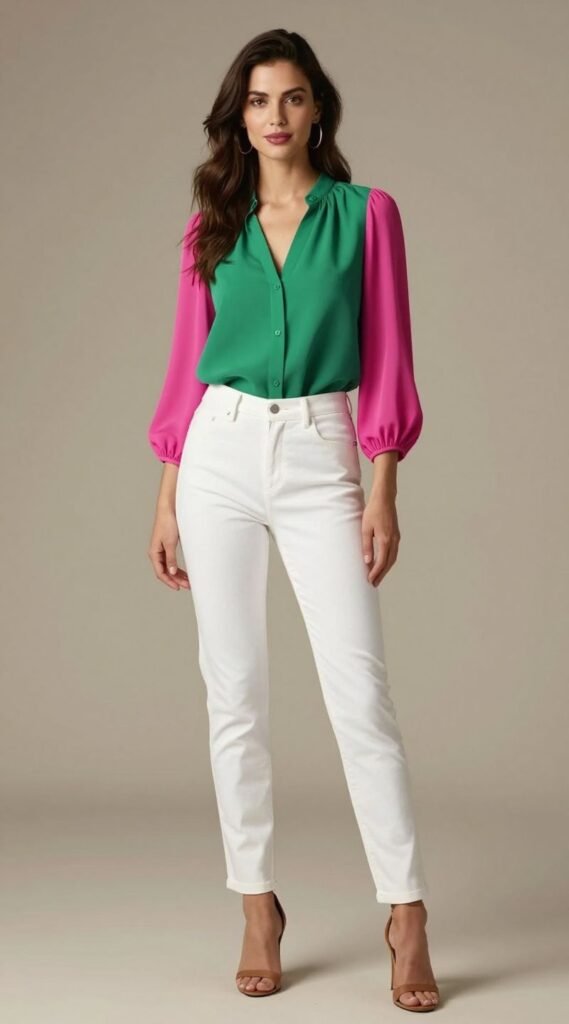 Sometimes, white pants are just begging for a vibrant companion. Take your favorite white slim-fit pants and throw on a bright, eye-catching fuchsia or emerald green blouse. Suddenly, you’re a walking masterpiece.