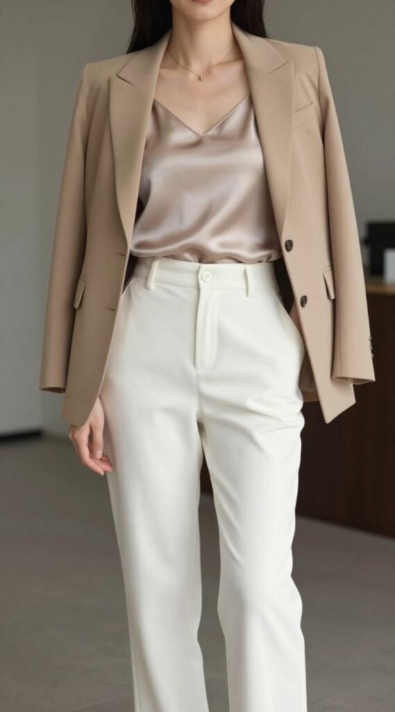 Who says white pants can’t mean business? Elevate your office style with tailored white trousers. Pair them with a luxurious silk camisole and a perfectly fitted lightweight blazer in a neutral shade like tan or light grey.