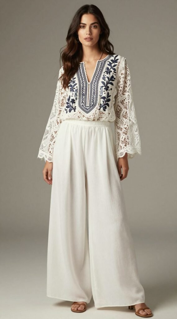 For those days when you want to feel free-spirited but still put-together, reach for some flowy white palazzo pants. Combine them with an intricately embroidered tunic top or a delicate lace blouse. Itโs bohemian rhapsody, but make it chic.