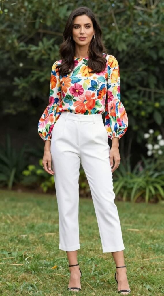 Headed to an outdoor event? Your white pants can totally come along. Opt for some sophisticated white capri pants or cropped trousers. Team them with a beautiful floral-print top that boasts vibrant summer hues.
