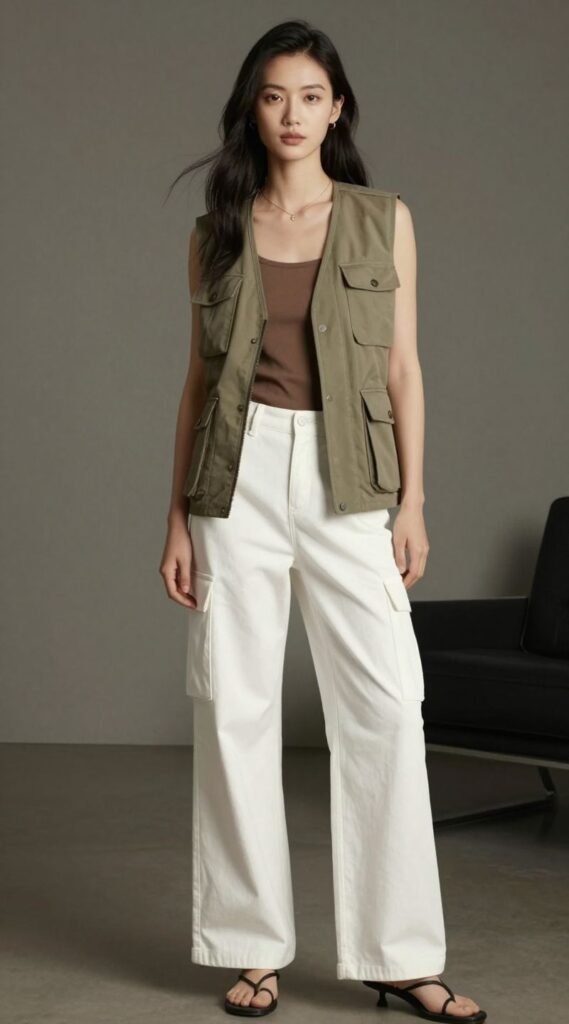 Channel your inner adventurer, but make it fashion. Dig out some stylish white cargo pants (yes, they can be chic!) or utility-style trousers. Pair them with a simple khaki or olive green utility vest over a basic white tee.